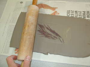 6) Place leaves or such on the middle section of the tray and push into the clay with the rolling pin.