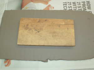 10) Place the piece of wood in the center of the slab (note that if the outside dimensions of the tray are 8"x12", the piece of wood need to be approx. 6"x10"). Make sure you place the lubricated side of the wood with the rounded corners on to the clay.