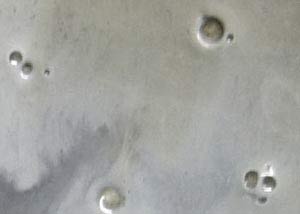 Blisters are evident on the fired glaze surface as a 'moonscape' of craters, some with sharp edges and others rounded. These craters are the remnants of bubbles that have burst during final approach to temperature or early stages of cooling. In some cases there will be some unburst bubbles with a fragile 'dome' than can be broken. Blisters can vary in size and tend to be larger where the glaze is thicker.