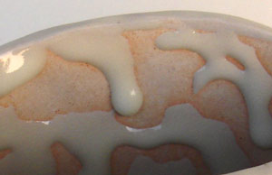 Crawling is where the molten glaze withdraws into 'islands' leaving bare clay patches. The edges of the islands are thickened and smoothly rounded. In moderate cases there are only a few bare patches of clay, in severe cases the glaze forms beads on the clay surface and drips off onto the shelf. The problem is most prevalent in once-fire ware.