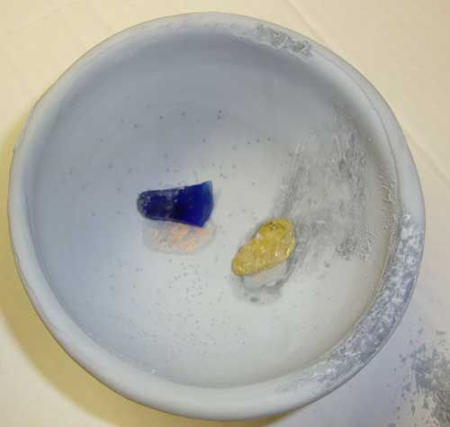 What Kind of Glass Should You Use on Pottery?Glass varies widely in melting temperature and chemical composition, which can significantly affect your final results. (See Appendix A and Appendix B below for detailed information.) At Lakeside Pottery Studio, we've tested a range of glass types, including broken bottles, sea glass, recycled window glass, and mosaic pieces, with mixed outcomes. One key lesson we learned is that appearance is not a reliable indicator: two pieces of glass that look identical can behave very differently in the kiln. For instance, one may retain its original green color while another turns white after firing, simply because they came from different sources. We also found that sea glass, despite its higher cost, produced the same results as ordinary broken glass, making it a less practical choice for this technique. Glass and Glaze Additives: