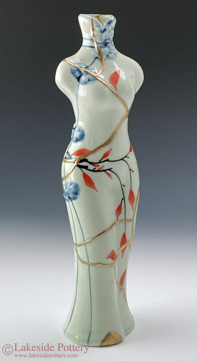 14 Before and After Kintsugi - Woman figure Cheongsam bud vase with Lotus design was repaired using 23.5K gold Kintsugi process. In Eastern religions such as Hinduism and Buddhism, the red lotus flower is often regarded as a representation of purity, rebirth, and divinity. It symbolizes rising from a dark place into beauty and rebirth very much similar to the meaning of Kintsugi.