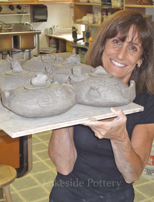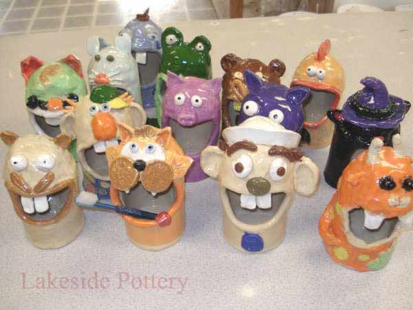 Below are some children clay project ideas designed for our pottery and ceramic art classes. The techniques used are: Slab, pinchpot, potter's wheel / handbuilding combination. We have over 100 distinct projects developed through the years to meet one of our most difficult goals which is: A child should not repeat a project even if they continue to take our programs for years. See related hand building lessons, how to, and more pictures links: Making Water Font Lesson, How to Make Coil Pot Tutorial, Making Clay Quilt Tutorial, Making Hedgehog Tutorial (Pinchpot) , Impressing Pattern on Clay, Making Clay Tile, Making Starfish and Sea Urchin, Hand Building Projects Ideas, More Pottery Tips