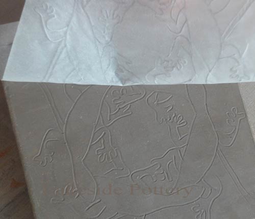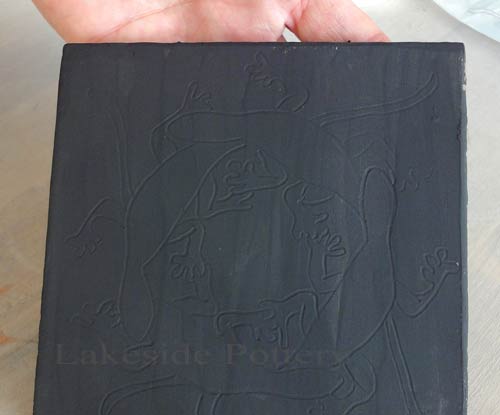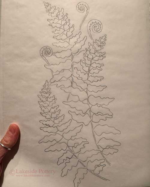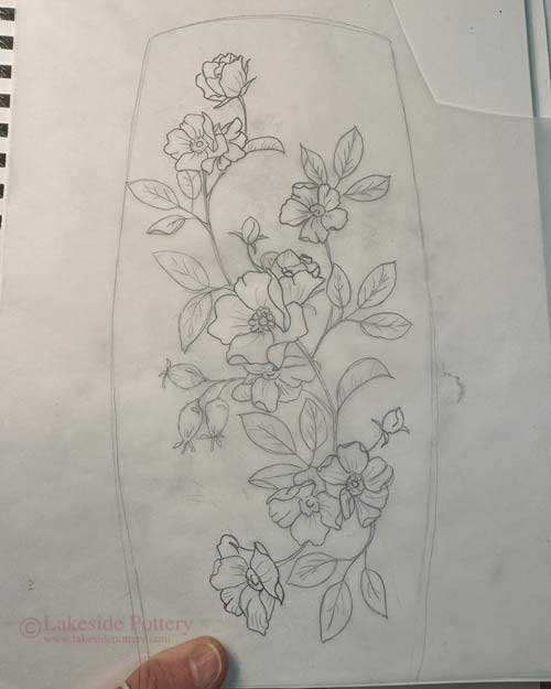 Transfer design to tracing paper and then use sharp pencil and trace design to clay. Tracing paper is flexible and able to withstand the wet clay and multiple tracings. If using black underglaze, we like Amaco V-370 or LUG-1 (V-370 has slightly better coverage). Both perform well up to cone 6 glaze firing.