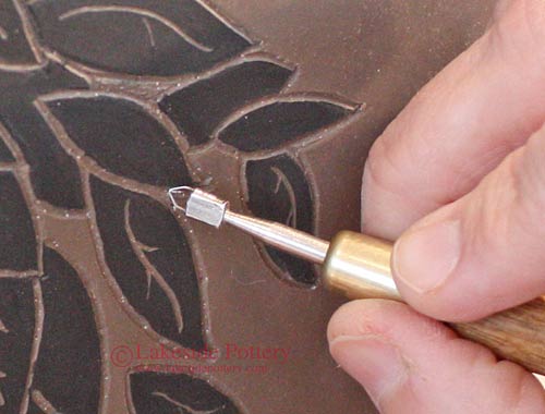 Clay: The clay should be at the leather-hard stage, firm enough to hold its shape under light pressure but not so dry that it cracks or resists carving. This stage provides the best surface for clean, sharp lines and prevents accidental gouging or smudging. For stronger contrast, we us Standard's clay 181 white stoneware