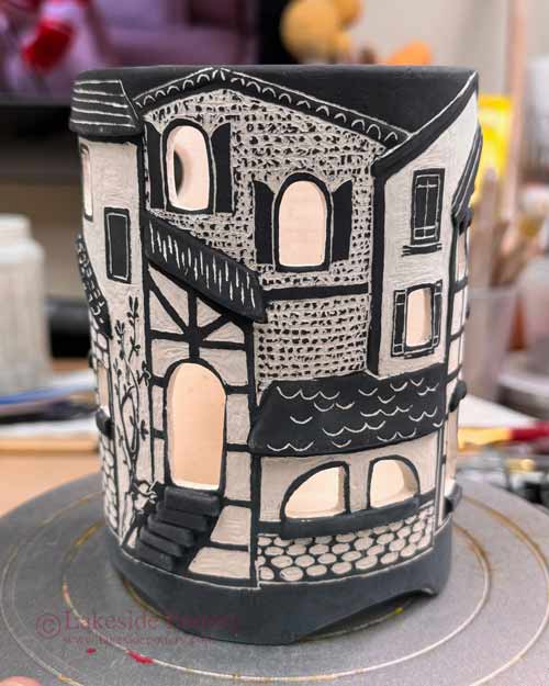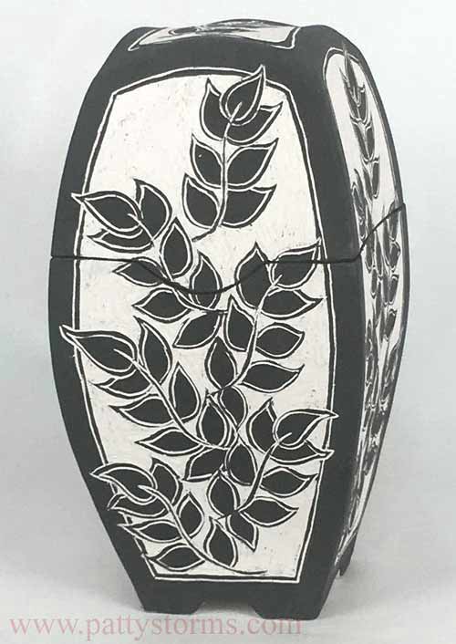 This project shows how Sgraffito can be used on curved surfaces with detailed designs. Working on urns requires careful planning, steady carving, and attention to drying stages. The steps below illustrate how layered underglaze and precise line work create bold, intricate patterns that elevate a simple vessel into a refined decorative piece.