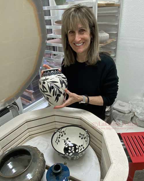 See a close-up photo of the surface at the bisque stage where the scratch marks are still visible. Once the clear glaze is applied and fired, it pools slightly into the carved areas, softening and masking most of those marks. When you touch the finished piece, you can feel that the black uncarved areas are slightly higher than the white, giving the surface a gentle raised texture.