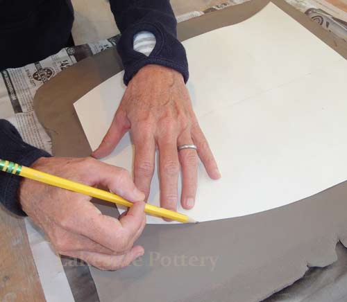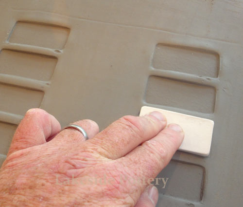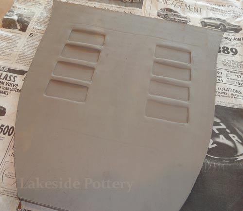 | The slab project below is a sample of our commission work requiring large slab construction using cone 6 high firing stoneware to ensure durability and longevity. The "high firing" challenge is to eliminate or minimize warping and cracking that typically occurs due to stoneware clay's high shrinkage rate (12% +). We took the opportunity to illustrate how to work effectively with large flat forms without cracking while minimizing warping.