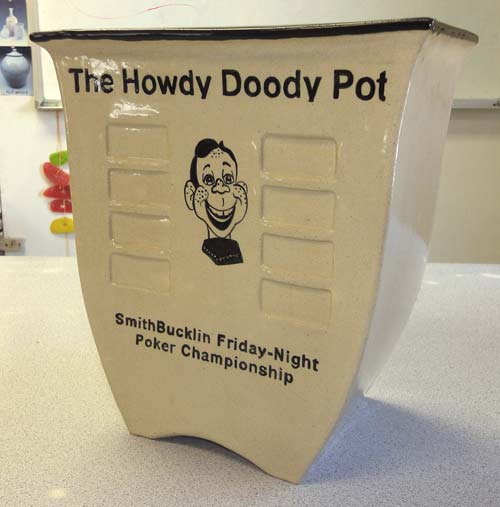 Large square-shaped slab construction can be frustrating. The key elements to success are: clay type (high grog content), how soft / hard the slab is in each stage of construction, slab is not too thin, use of miter cutting (45 degrees), using coil to round all slab connection points, use of magic water instead of slip, avoiding clay bending throughout the process, proper drying and firing schedule and kiln programming. This project consists of two trophies that are ready to accept 16 winning plaques on each side with Sgraffito drawings and writing.