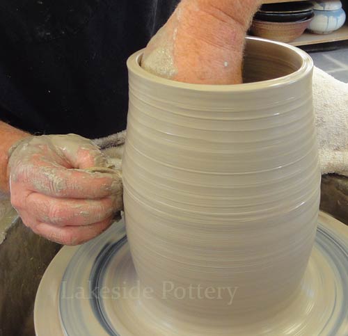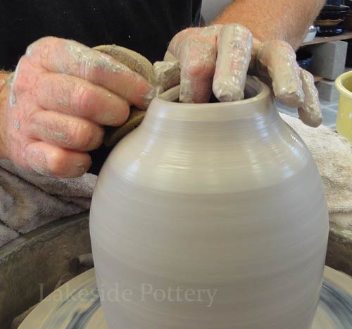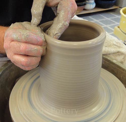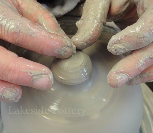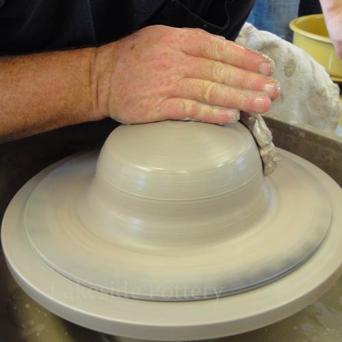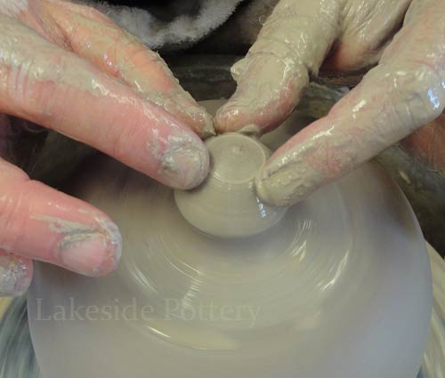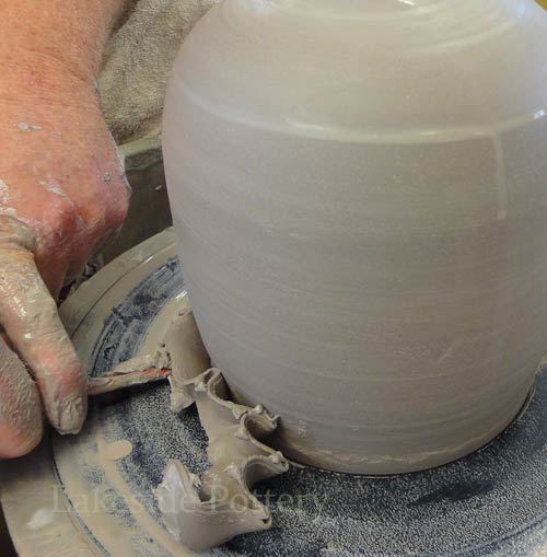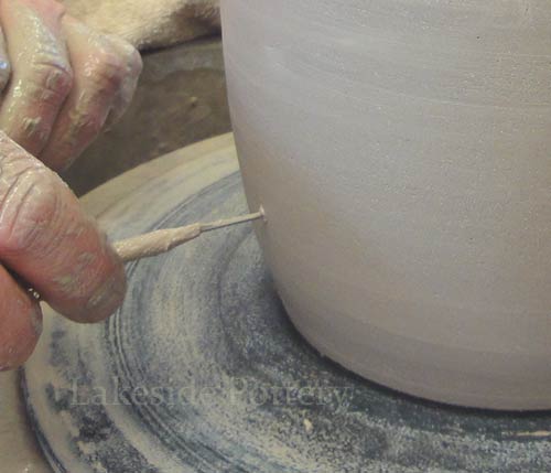 Note: Make the slit cut on the wheel by keeping the cutting knife steady while turning the pottery wheel slowly to insure a perfect parallel cut. Trimming the pot upside down may be difficult (pointy top) and trimming on the wheel as illustrated, will safe the trouble later.
