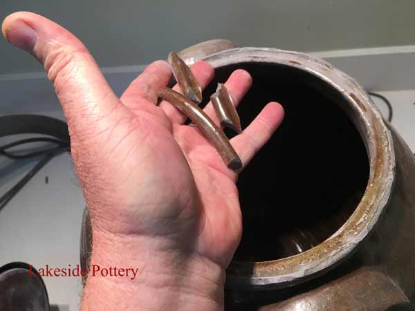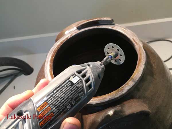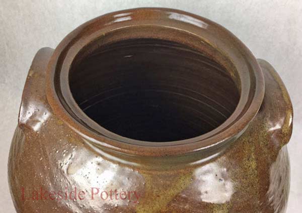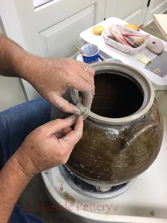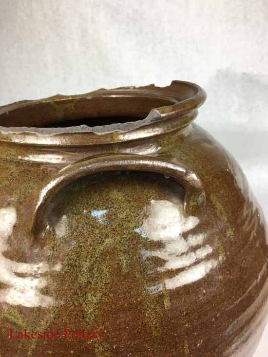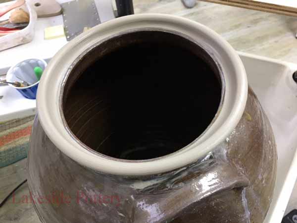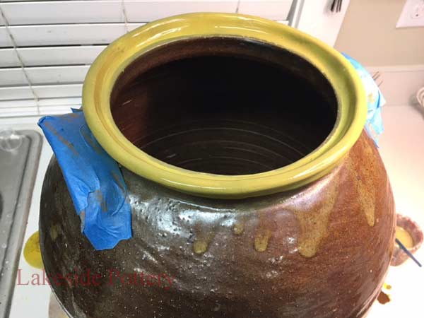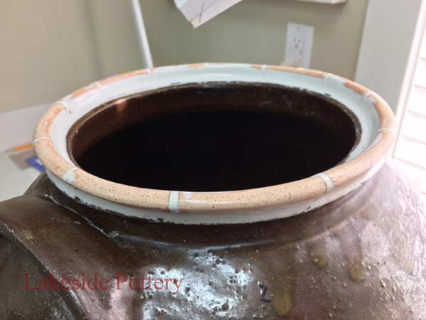 This crock came to us from a collector who claimed it is rare and valuable. Most of the rim was broken off and missing. There are more than one method to create a new rim but in this case, given the required continuity and unevenness, throwing the rim on the potter's wheel was the selected option.