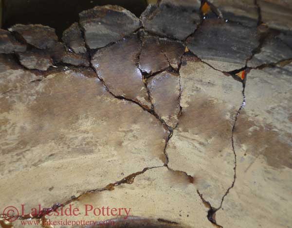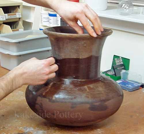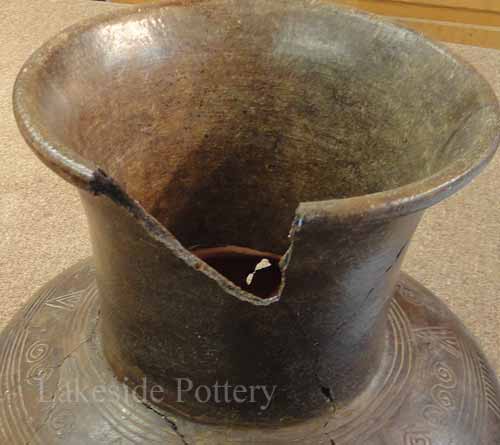 To apply staining with effective color and sheen matching, after cementing all the pieces, we used a tinted filler, mixing the filler with natural pigments, that had the same porosity performance as the vase's clay body. Once the filler cured and was sanded, we applied additional staining applications for color and color variation fine tuning to achieve a closer match. Finally, "aging" techniques were used for completion.