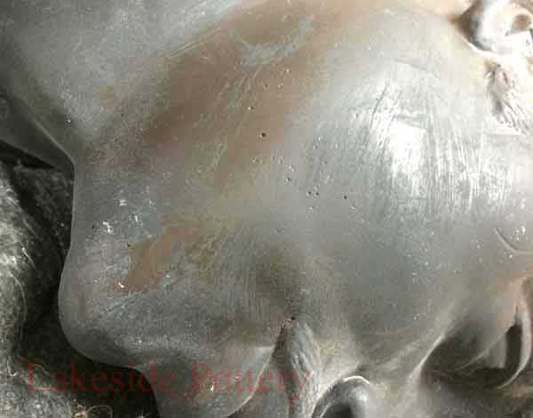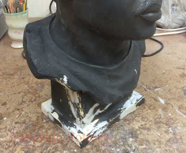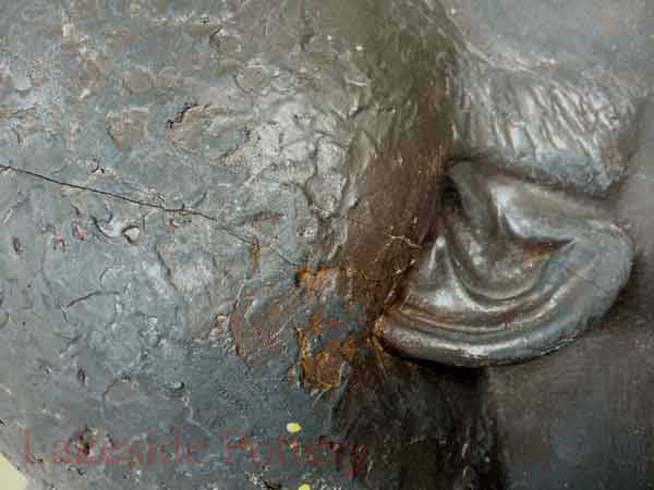 The bust restored in this project is the plaster version, not the bronze. When it arrived at Lakeside Pottery Restoration Studio, it was broken, cracked, and missing pieces, with multiple layers of failed repair and repaint attempts. The photos below highlight key steps of the restoration process, with explanations provided under each image.