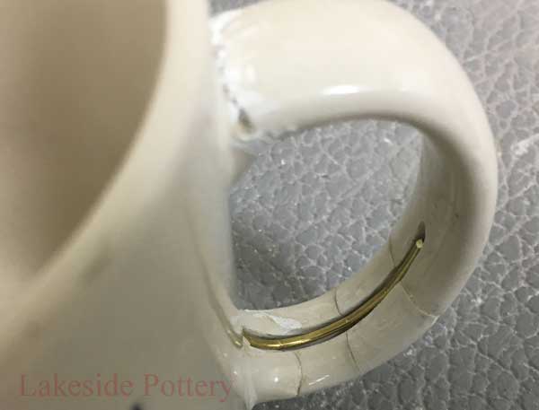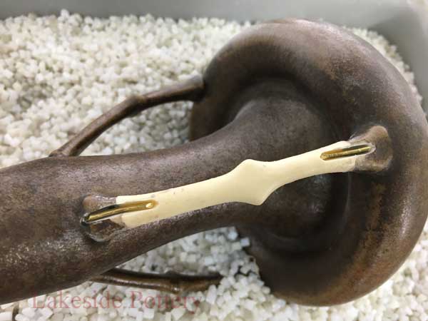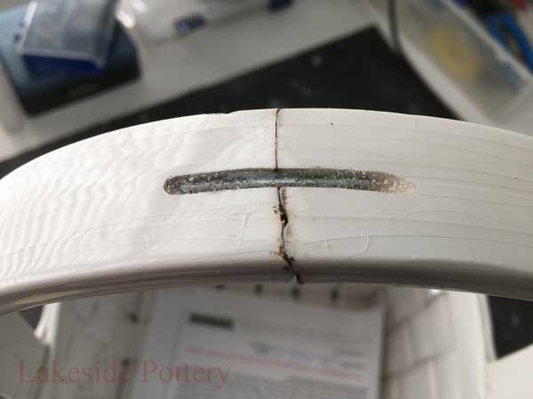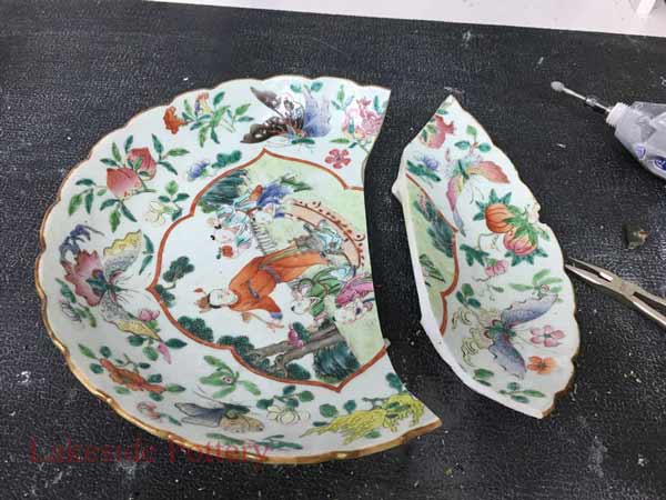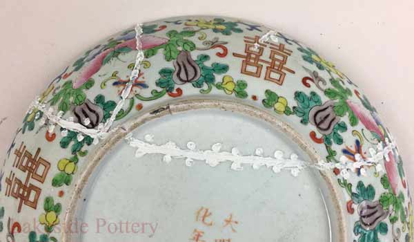 Hundreds of years ago before the availability of adhesives, pottery was repaired with metal staples or rivets on particularly valuable pieces holding together the broken ceramic segments. Small holes were drilled into the piece and then the staples were inserted. The remaining holes space were sometimes filled with organic glue or clay colored or painted to conceal the repair.