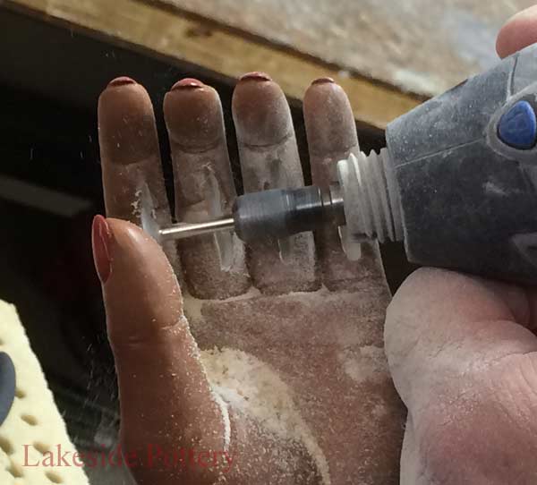Four pegs inserted in fingers, filled and sanded ready for painting