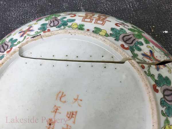 We often receive antique Japanese or Chinese vessels repaired with staples and are asked to convert them to a seamless repair. In each case, we attempt to convince the owner to keep the staple-repaired vessel as is to appreciate its beauty and the skill required to join broken pottery at a time when adhesives were not available. When we do reverse the old repair, as I remove the old staples, I find myself saddened apologizing to the skilled person who skillfully brought the vessel back to life long before I was born. This page was created to shed some light on this extinct repair method, its beauty, and its historical value with the hope that it remains as is.