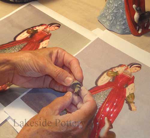 This figurine arrived with a missing hand. The owner purchased it "as is" for a nominal amount through eBay, commissioned us to restore it, and gained a perfectly complete figurine for a fracture of a market value price. The challenge in this project is sculpting the very detailed hand and attaching it using a pin for good mechanical integrity. To see repair examples of broken figurines, broken statues, and broken china, see our restoration examples.
