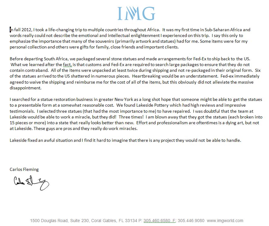 This 200 lbs Spring or Shona stone sculpture came to us very broken. The objective was to put the sculptures together using metal rods to insure proper structural integrity. Than, we had to sculpt, with clay, the missing pieces, fire them in a kiln and cement them in place. All cracks, chips and dings had to be filled, polished and treated. The stone multi-colors required painting details and the glazing / waxing had to match natural stone luster. Stone luster needed to be absorbed by the added materials / fillers without any build up. Any build up would have made the finished effect look like a ceramic vessel and not a stone. Note: This repair is not suitable for outdoors use.