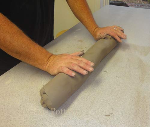 2) Roll the coil on a non-absorbent table to insure clay stays moist and soft. Make the coil as even as possible. Place coil on the tapered edge created on the first stage flat form.