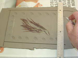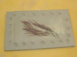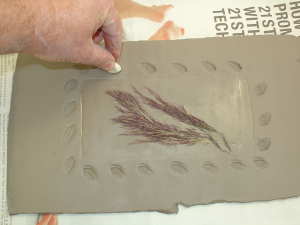 6) Place leaves or such on the middle section of the tray and push into the clay with the rolling pin.