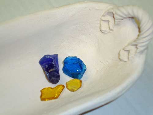 What Kind of Glass Should You Use on Pottery?Glass varies widely in melting temperature and chemical composition, which can significantly affect your final results. (See Appendix A and Appendix B below for detailed information.) At Lakeside Pottery Studio, we've tested a range of glass types, including broken bottles, sea glass, recycled window glass, and mosaic pieces, with mixed outcomes. One key lesson we learned is that appearance is not a reliable indicator: two pieces of glass that look identical can behave very differently in the kiln. For instance, one may retain its original green color while another turns white after firing, simply because they came from different sources. We also found that sea glass, despite its higher cost, produced the same results as ordinary broken glass, making it a less practical choice for this technique. Glass and Glaze Additives: