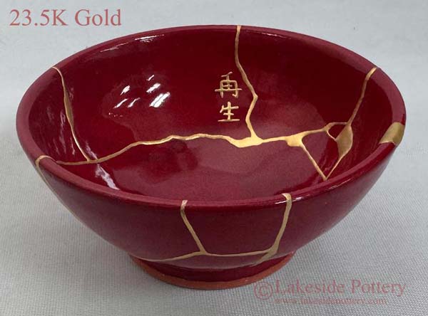 A handmade red-glazed vase and bowl set, Kintsugi repaired using the 23.5K gold process. The set was made to meet a customer's requirements, who was seeking the 'rebirth' metaphor. The red glaze color was chosen to symbolize strength, sacrifice, joy, and happiness - qualities associated with the color red in Japanese culture.