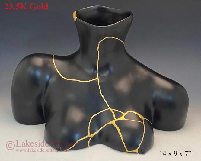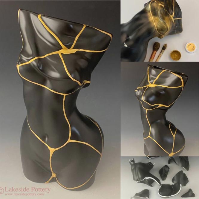 Before and After Kintsugi - Female body vase repaired with 23.5K gold Kintsugi