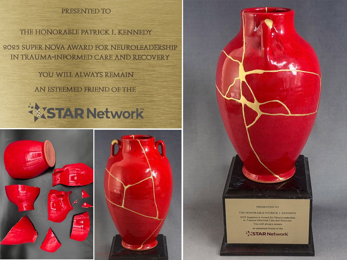 08B 23.5K gold-repaired Kintsugi vase was created as an award for former U.S. Congressman Patrick J. Kennedy, recognizing his mental health advocacy. Presented during STARs Day 2025 by the STAR Network Foundation