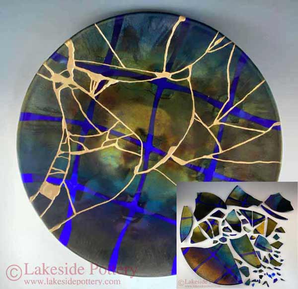 Before and After Kintsugi - Lynn Latimer Kintsugi Iridescent Glass -- 17" shallow bowl / platter"