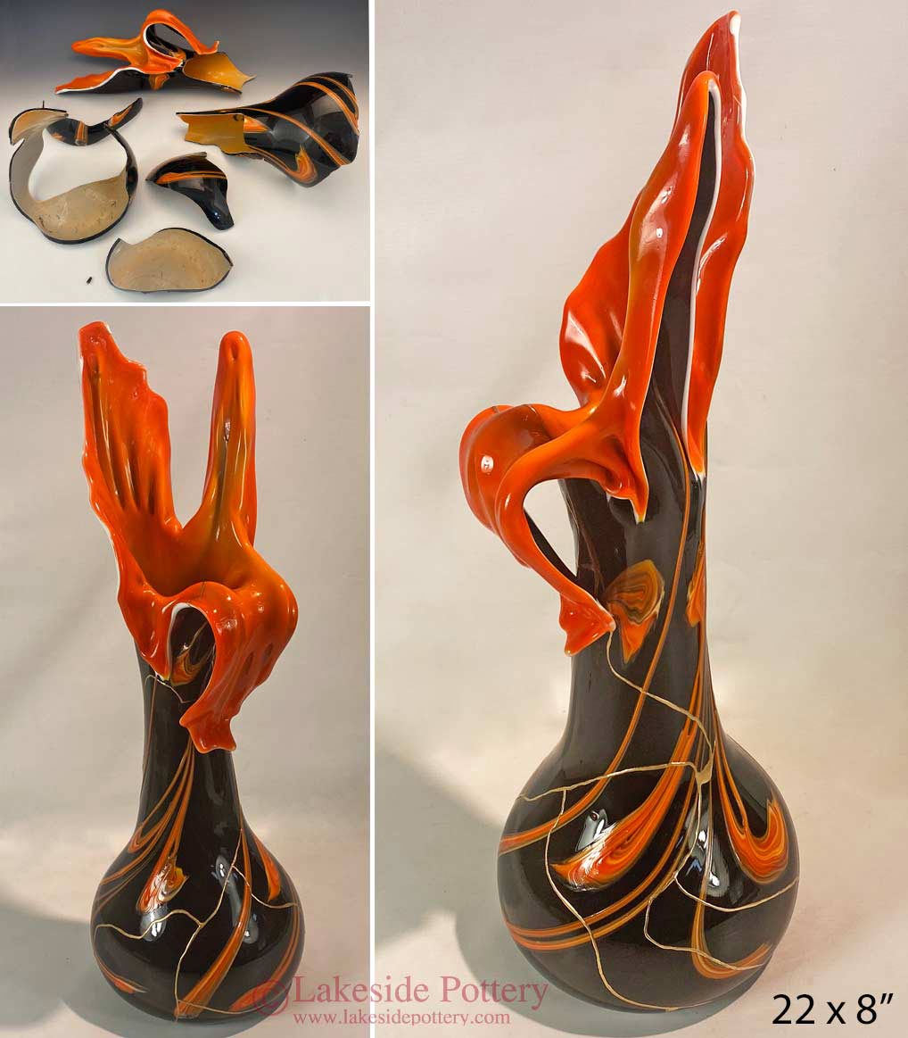 Before and After Kintsugi - Large Kintsugi Raku vase before and after repair