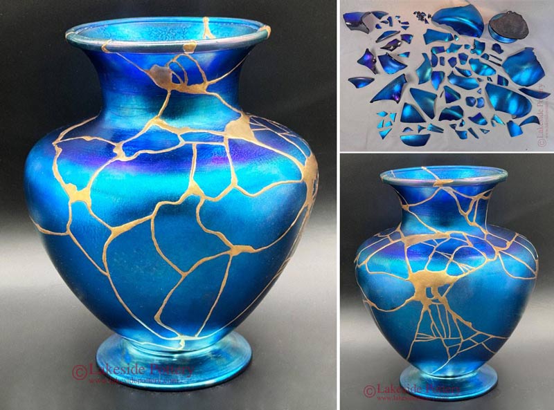 Crystalline Cobalt blue Gold Kintsugi vase - before and after