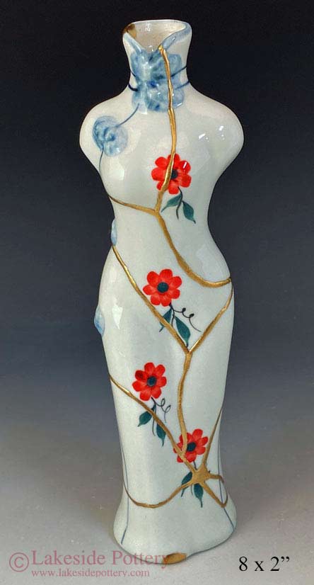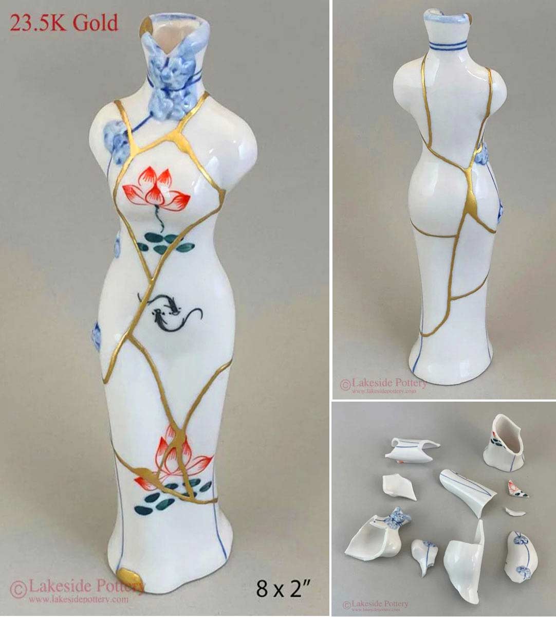 14 Before and After Kintsugi - Woman figure Cheongsam bud vase with Lotus design was repaired using 23.5K gold Kintsugi process. In Eastern religions such as Hinduism and Buddhism, the red lotus flower is often regarded as a representation of purity, rebirth, and divinity. It symbolizes rising from a dark place into beauty and rebirth very much similar to the meaning of Kintsugi.