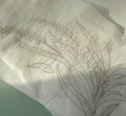 Transfer design to tracing paper and then use sharp pencil and trace design to clay. Tracing paper is flexible and able to withstand the wet clay and multiple tracings. If using black underglaze, we like Amaco V-370 or LUG-1 (V-370 has slightly better coverage). Both perform well up to cone 6 glaze firing.