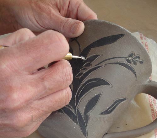 When performing the scratching or carving in Sgraffito, it is essential that the clay is at the leather-hard stage, similar in feel to firm cheddar cheese. At this consistency, the clay is strong enough to hold its shape yet soft enough for smooth, controlled scraping. Working at this stage makes the process easier, more effective, and safer, as no harmful dust is created and your tools will not wear down as quickly.