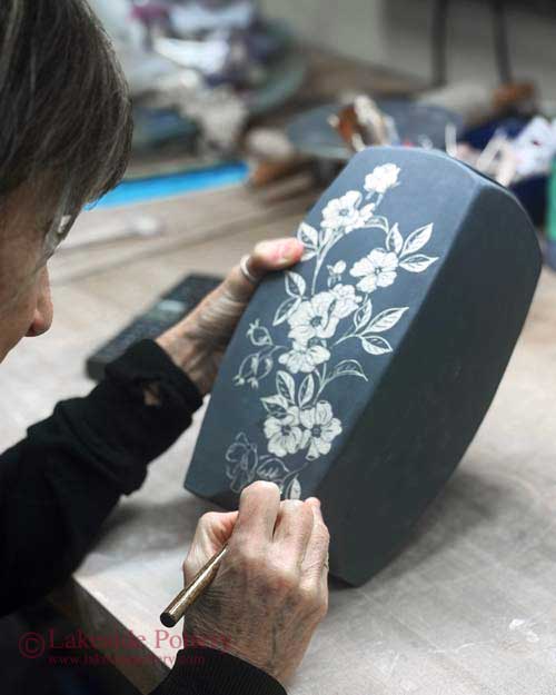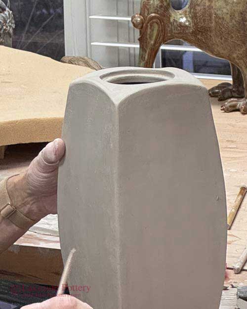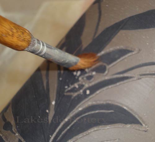 Always keep your piece covered between tasks to preserve the cheddar cheese like consistency. If the surface becomes too dry, a fine misting with water will restore the proper workability without affecting the underglaze or design. After spraying, wait a short while for the moisture to absorb before handling to prevent smearing or lifting of the underglaze.