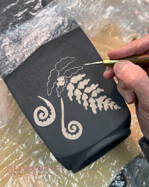 See a close-up photo of the surface at the bisque stage where the scratch marks are still visible. Once the clear glaze is applied and fired, it pools slightly into the carved areas, softening and masking most of those marks. When you touch the finished piece, you can feel that the black uncarved areas are slightly higher than the white, giving the surface a gentle raised texture.