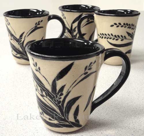 The cups below use a slightly different technique than above. Only the traced pattern is painted on and the outline and lines within the pattern are scratched off.