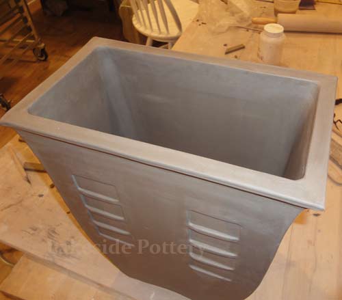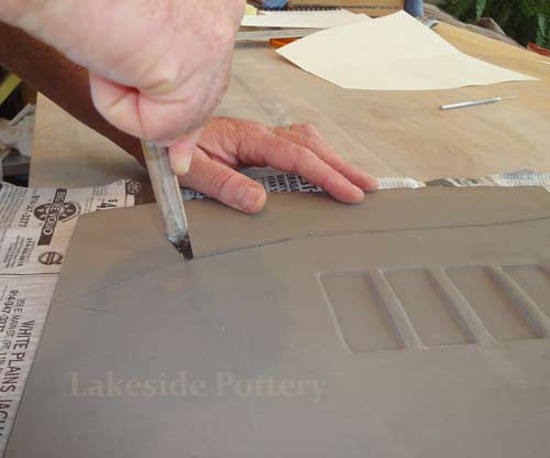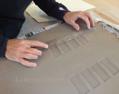 | The slab project below is a sample of our commission work requiring large slab construction using cone 6 high firing stoneware to ensure durability and longevity. The "high firing" challenge is to eliminate or minimize warping and cracking that typically occurs due to stoneware clay's high shrinkage rate (12% +). We took the opportunity to illustrate how to work effectively with large flat forms without cracking while minimizing warping.