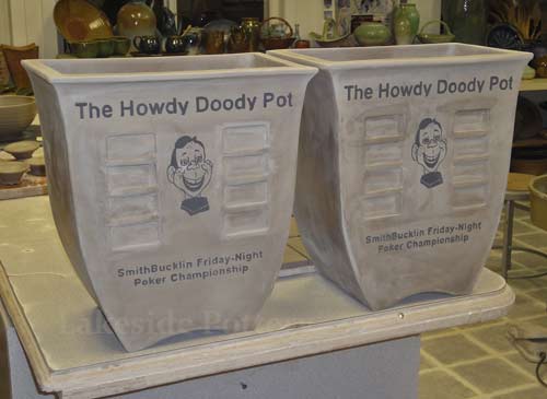 Large square-shaped slab construction can be frustrating. The key elements to success are: clay type (high grog content), how soft / hard the slab is in each stage of construction, slab is not too thin, use of miter cutting (45 degrees), using coil to round all slab connection points, use of magic water instead of slip, avoiding clay bending throughout the process, proper drying and firing schedule and kiln programming. This project consists of two trophies that are ready to accept 16 winning plaques on each side with Sgraffito drawings and writing.