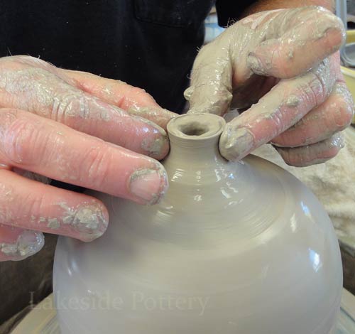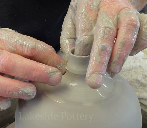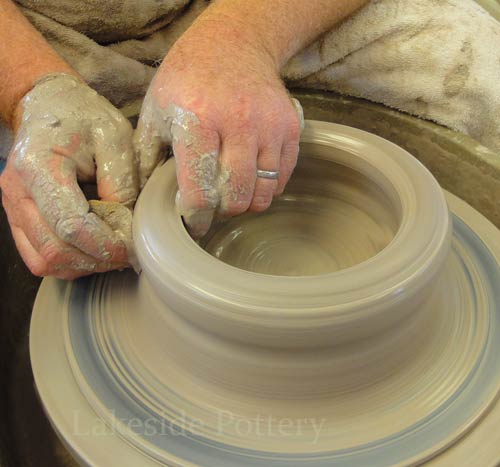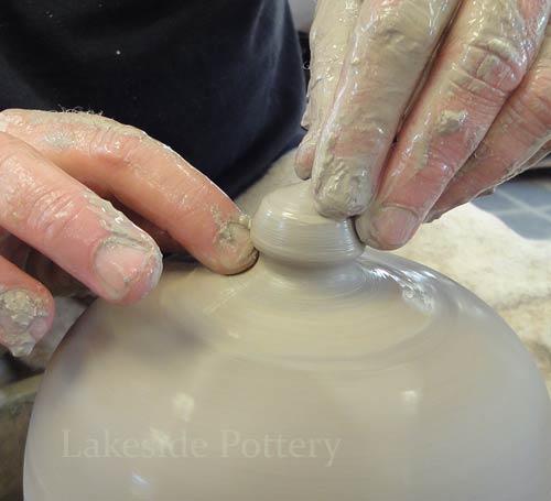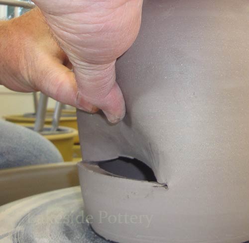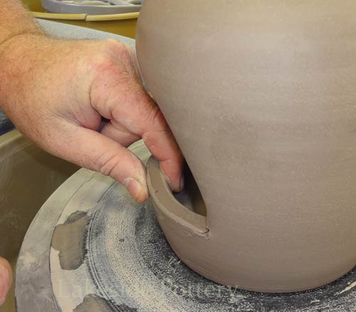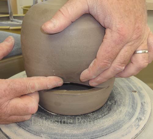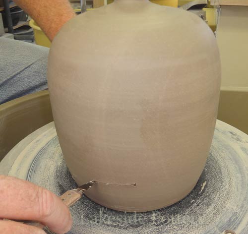 Note: Make the slit cut on the wheel by keeping the cutting knife steady while turning the pottery wheel slowly to insure a perfect parallel cut. Trimming the pot upside down may be difficult (pointy top) and trimming on the wheel as illustrated, will safe the trouble later.
