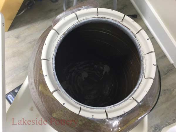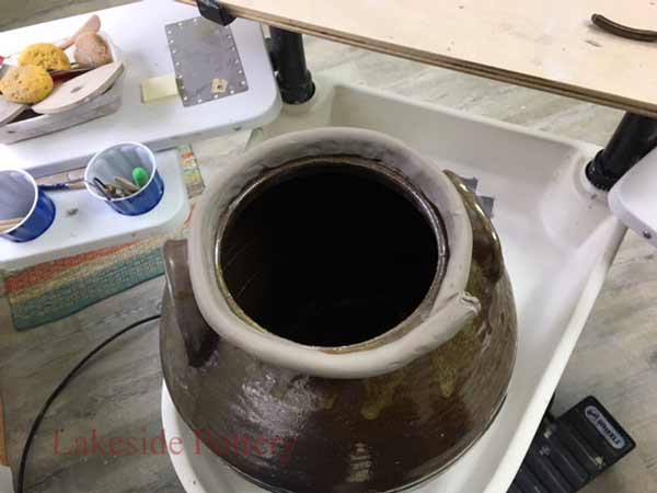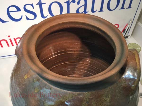 This crock came to us from a collector who claimed it is rare and valuable. Most of the rim was broken off and missing. There are more than one method to create a new rim but in this case, given the required continuity and unevenness, throwing the rim on the potter's wheel was the selected option.
