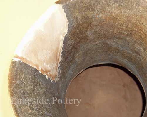 To apply staining with effective color and sheen matching, after cementing all the pieces, we used a tinted filler, mixing the filler with natural pigments, that had the same porosity performance as the vase's clay body. Once the filler cured and was sanded, we applied additional staining applications for color and color variation fine tuning to achieve a closer match. Finally, "aging" techniques were used for completion.