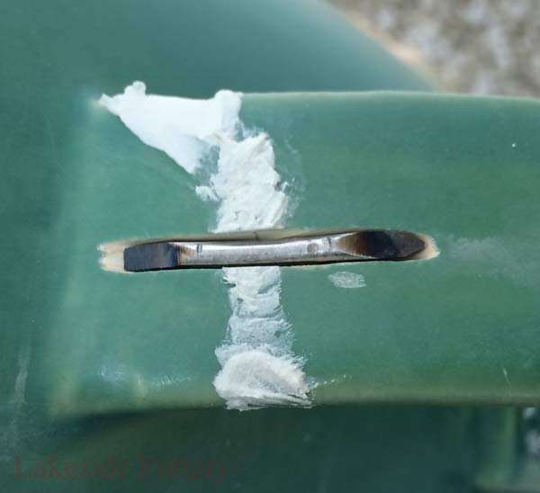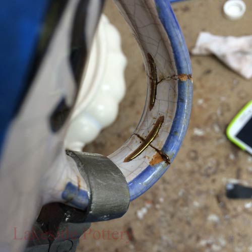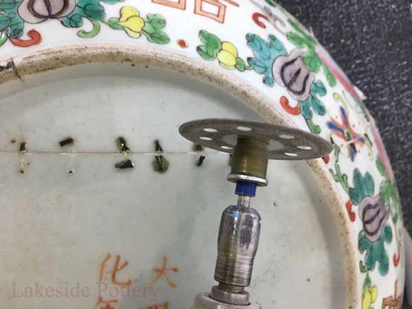 Hundreds of years ago before the availability of adhesives, pottery was repaired with metal staples or rivets on particularly valuable pieces holding together the broken ceramic segments. Small holes were drilled into the piece and then the staples were inserted. The remaining holes space were sometimes filled with organic glue or clay colored or painted to conceal the repair.