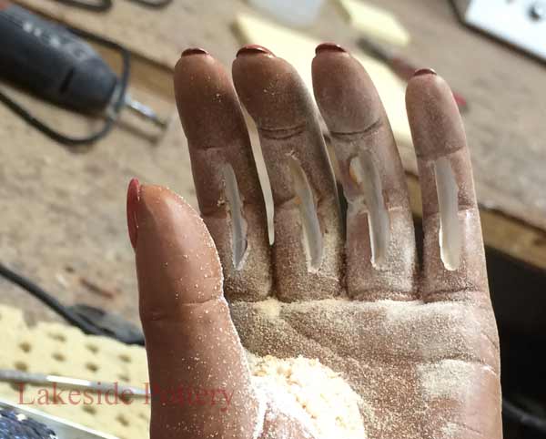 Four pegs inserted in fingers, filled and sanded ready for painting