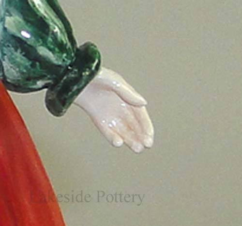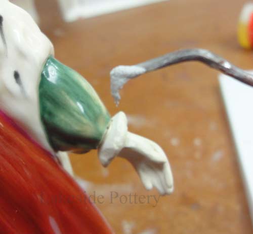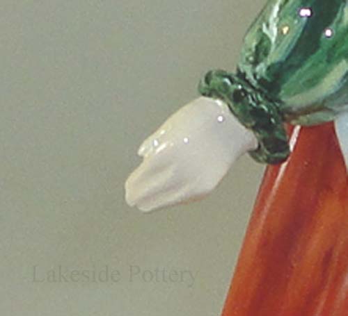 This figurine arrived with a missing hand. The owner purchased it "as is" for a nominal amount through eBay, commissioned us to restore it, and gained a perfectly complete figurine for a fracture of a market value price. The challenge in this project is sculpting the very detailed hand and attaching it using a pin for good mechanical integrity. To see repair examples of broken figurines, broken statues, and broken china, see our restoration examples.