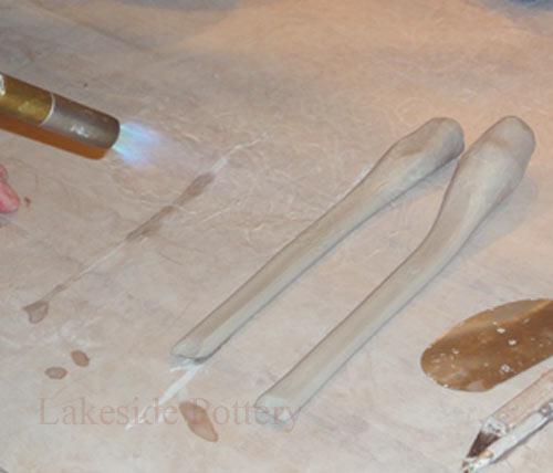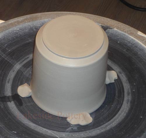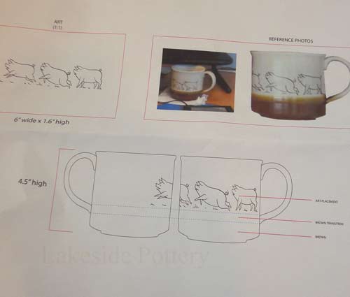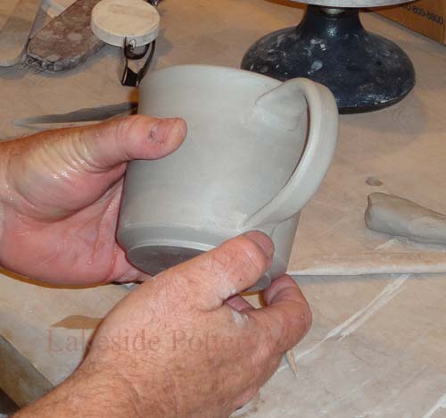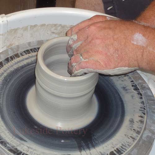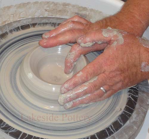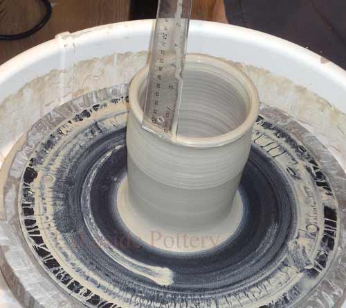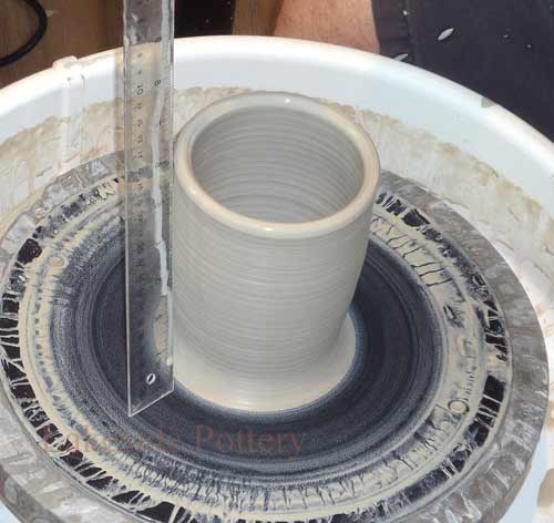 | Below is a step by step illustration of throwing, trimming, handle pulling and glazing a custom made mug to a very specific customer requirements spec. The efforts starts with understanding what the customer would like to achieve and how he / she is planning to use it. The finished product is white stoneware and is functional and durable (microwave oven, oven, dishwasher). Because it is high fired, one must remember to factor in the shrinkage. In our case, the clay shrinks 13% through the full process of drying, bisque firing (cone 06) and glaze firing (cone 6). |