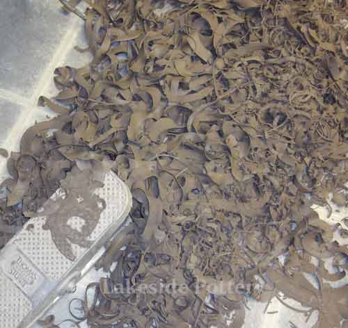 5) It is important that the end of the flat form is compressed, water / slurry free and tapered from 1" thickness to 1/3". This surface is used as a socket to accept the next coil. Being further from the center, the next coil needs be longer and therefore will require more clay. In this demo, the third and last amount of clay is about18 lbs. Because the coil is not 100% even, you might end up with uneven edge. Using extruded coil (as oppose to hand made coil), will eliminate wrestling with unevenness potential. Correct the end by removing the uneven part with a pintool as shown below.