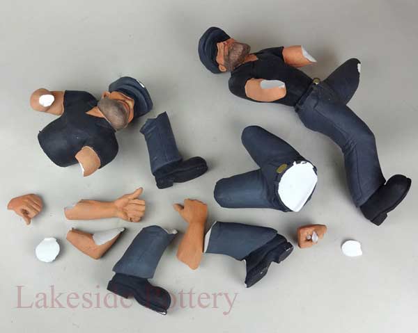 My wife bought 3 sculptures and unfortunately I broke two of the 3 men, each in many pieces. Lakeside pottery put them back together so they could join their brother. The repair exceeded my expectation in every way. Now it is impossible to tell which 2 were repaired. I am truly impressed and grateful.